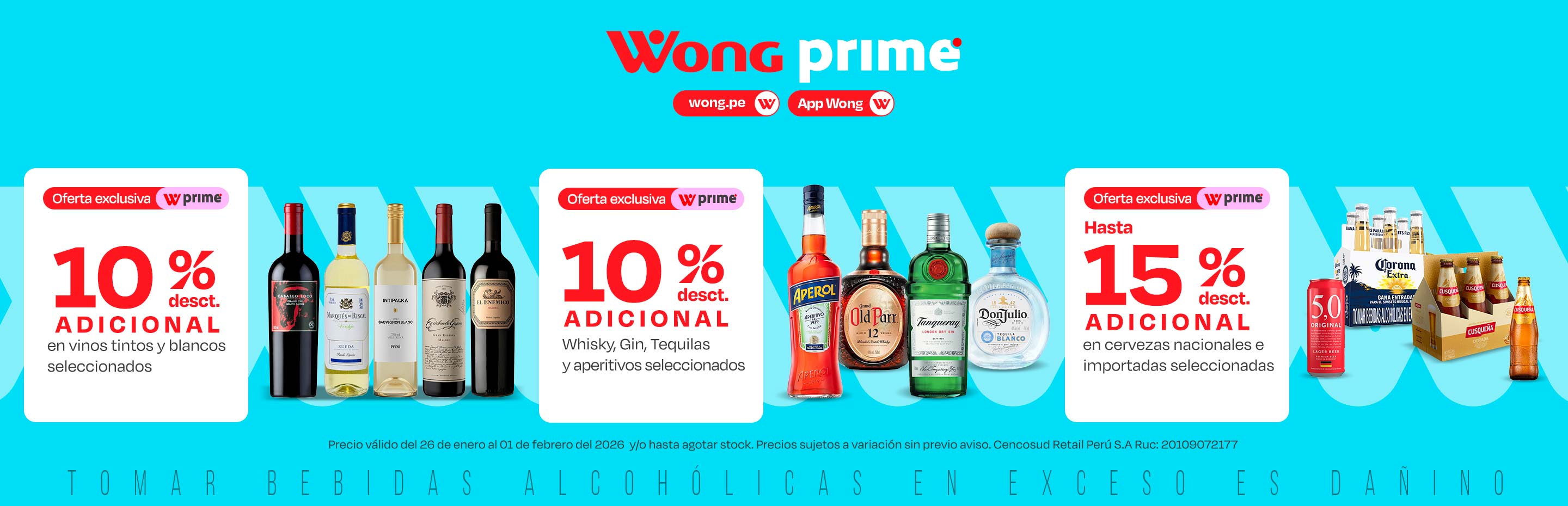 Si buscas bebidas para tus reuniones o momentos especiales, en Wong Prime también puedes disfrutar de una amplia gama de cervezas, vinos, licores, piscos y espumantes. Elige entre marcas destacadas a nivel nacional e internacional como Tabernero, Nieto Senetiner, Intipalka, FInca Rotondo, Viñas de Oro, Johnnie Walker, Bianchi, entre otras.